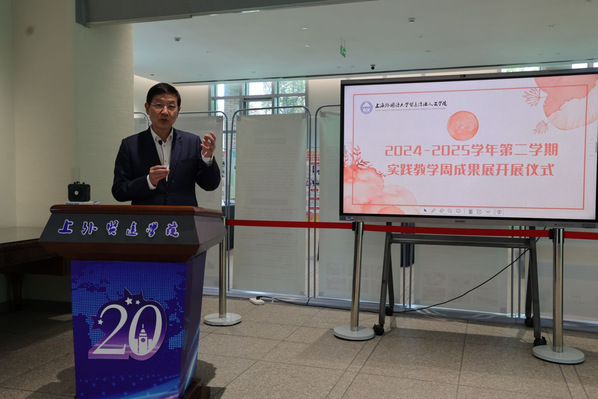 仪式上,郑方贤校长发表致辞,他充分肯定了教务处及各学院(中心)在实践教学周中的工作成效,并指出,实践教学周旨在集中组织与强化实践教学内容,从上学期首次启动时以企业导师讲座为基础的项目探索,到本学期引入真实项目的深度赋能,实践教学的内涵与质量实现了显著提升。他强调,各学院应紧密结合学科专业特点,尤其是外语学院、商学院等以知识传授为主的学科专业,需进一步打破传统教学壁垒,以课程为单元系统化设计高质量实践教学项目,将其全面纳入课程教学方案,并深度融入实践教学周,全力打造更高水平的实践教学成果展,推动实践育人迈向新高度。