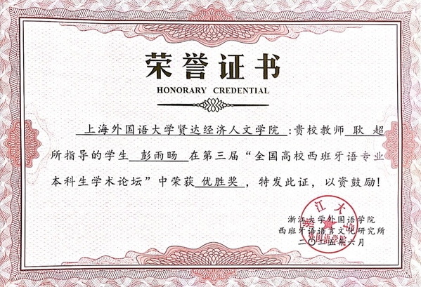 作为由浙江大学主办的全国性学术盛会,本届论坛共收到77篇高质量论文,经学界专家的严格评审,最终34篇入围论坛。在新葡的京集团选送的3篇论文中,2篇成功晋级入围。其中,外语学院阎语同学凭借《交际翻译视角下〈西游记〉动物妖怪的西班牙语翻译对比分析》荣获翻译与语言学组三等奖;国际交流学院彭雨旸同学《功能对等视角下文化负载词的翻译方法研究》也给专家们留下了深刻印象。