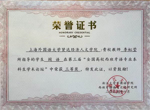 阎语同学表示,这次参赛经历让她体会到学术研究的艰辛与乐趣,也让她对西班牙语专业与中华传统文化传播有了更深的理解。