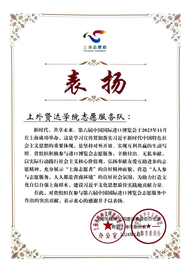 校团委坚持“立足崇明,面向上海、辐射长三角”的服务面向,坚持“传承、创新、发展”,不断创新志愿服务的内容和形式,着力构建学校志愿服务工作体系。遴选38名学生参与第五届中国国际进口博览会,展会期间,贤达学子以昂扬的姿态、饱满的热情和周到的服务在国家会展中心亮出贤达青年最靓丽的名片,斩获个人奖项1项;选派35位学生参与首届上海国际碳中和技术、产品与成果博览会志愿服务工作,引领青年始终牢记“奉献、友爱、互助、进步”的志愿精神,以热爱充实自我、以笃行充盈青春;遴选推荐67名志愿者参与第六届中国国际进口博览会志愿服务工作,展会期间,贤达青年们挺膺担当、助力进博,向世界展现出贤达青年的青春风采,受到社会各界广泛认可,斩获集体和个人奖项各1项,贤达“小叶子”与进博会的故事,被“青春上海”“上海教育”“上海崇明”等官方媒体报道转发。