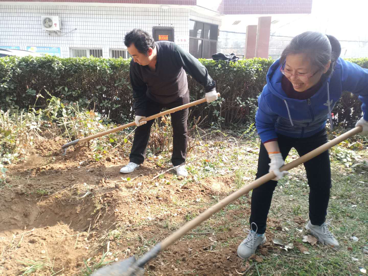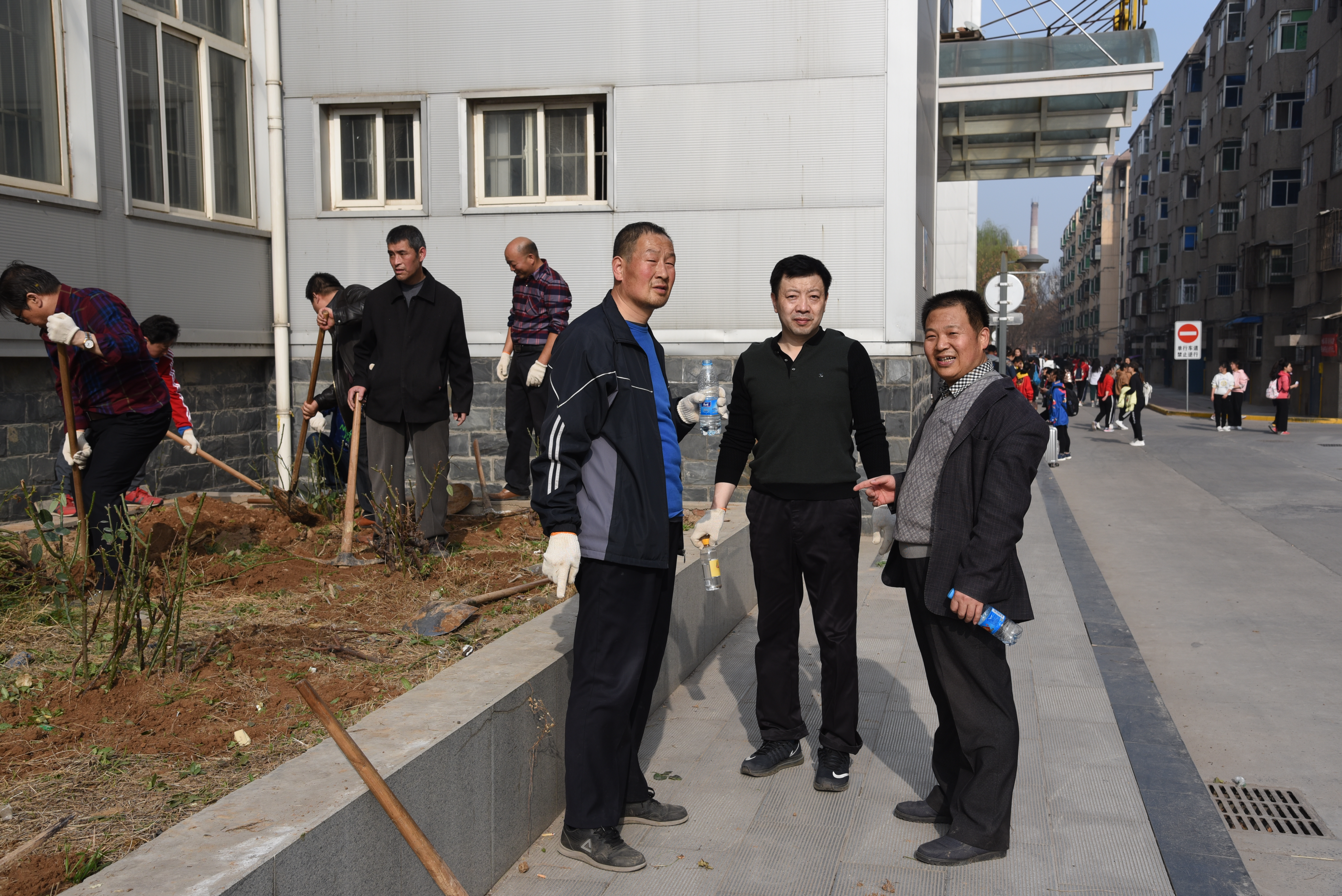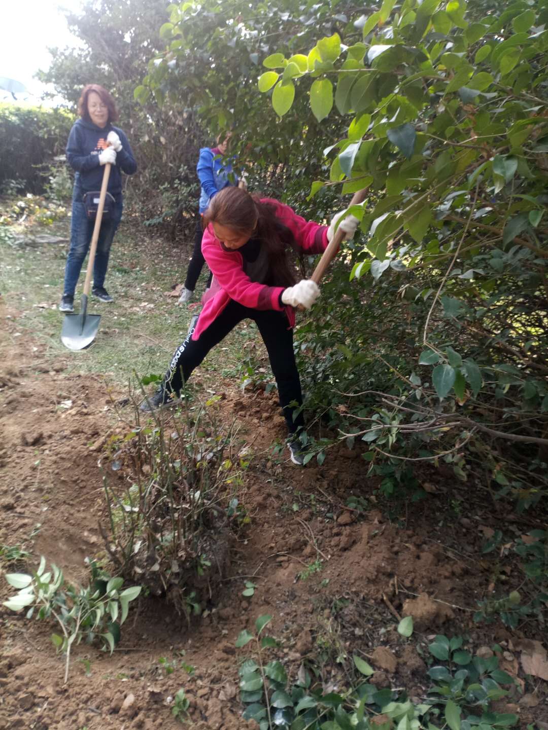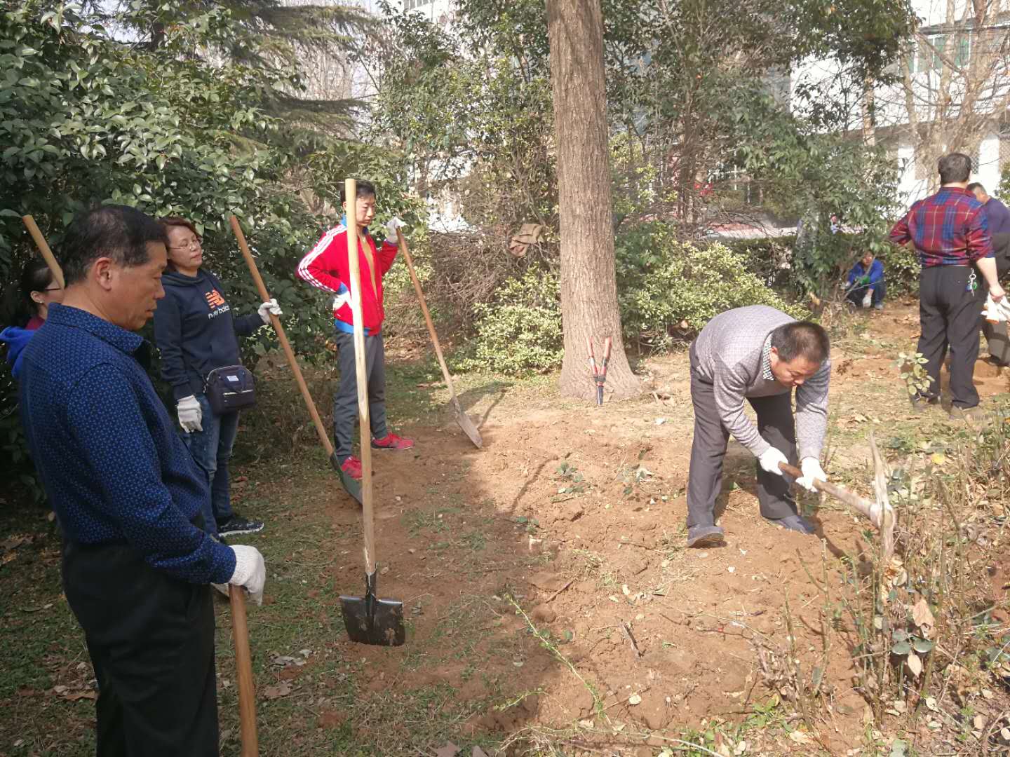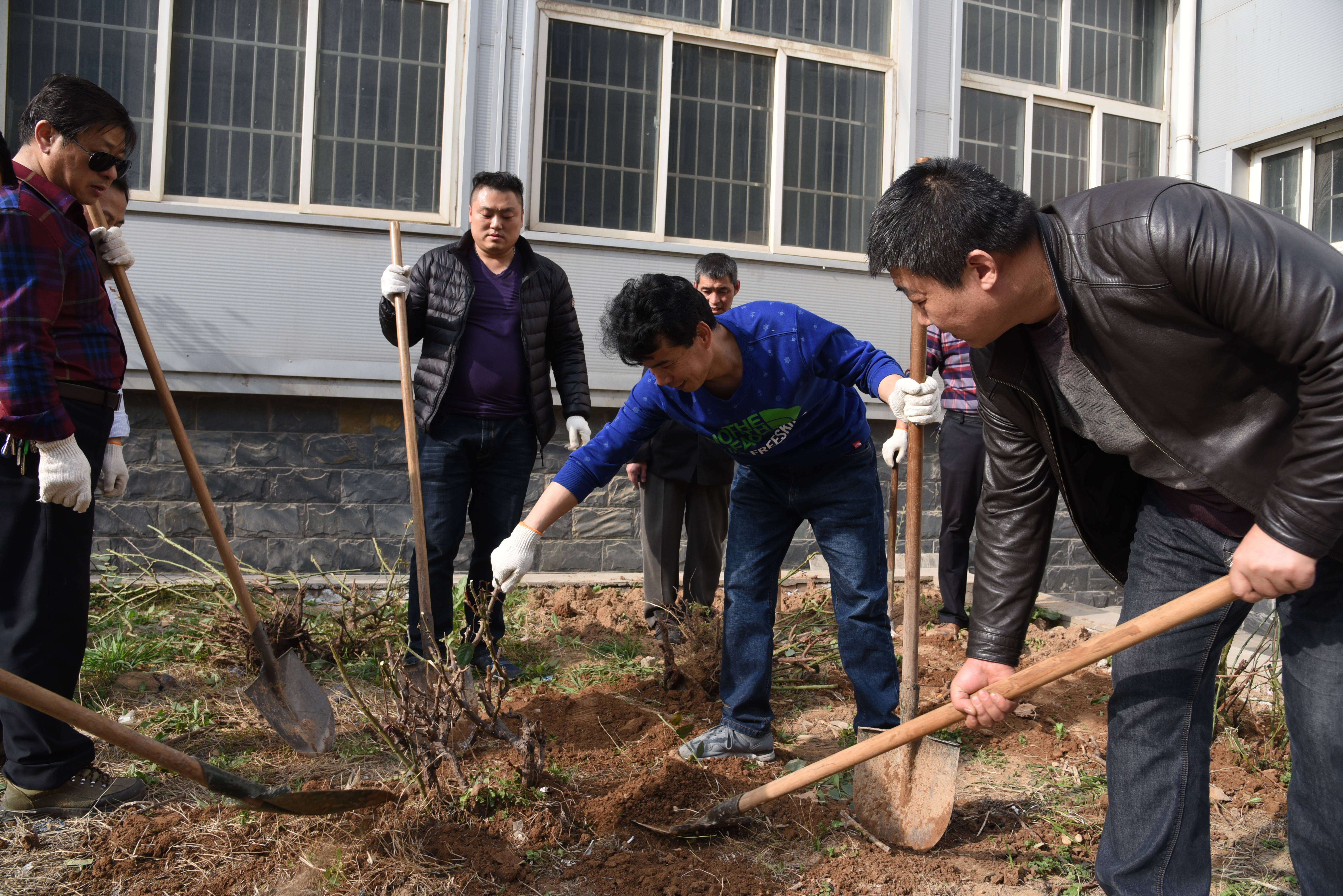 植树前,校园管理中心的同志准备了两辆用于花木运输的三轮车和充足的铁锹、头、手套,华泰物业部为植树后的浇水和环境卫生的整饬做了充分准备。在植树现场,大家拿起铁锹、头,在校园管理中心专业人员的指导下开始挖树,挖树的时候,大家都非常的谨慎,头和铁锹每次都一点一点的深入,生怕破坏到大的根系,影响移栽后的成活率。移植时,大家总是把土坑挖得比较大,然后一人扶正树木,其实人共同均匀填土,保证了树木移栽后的端庄、挺拔。大家互相配合,忙得不亦乐乎。经过近三个小时的劳动,给体育馆南边的花园中新添了一片树木,经过现场浇水,再过几天将是一片新绿。