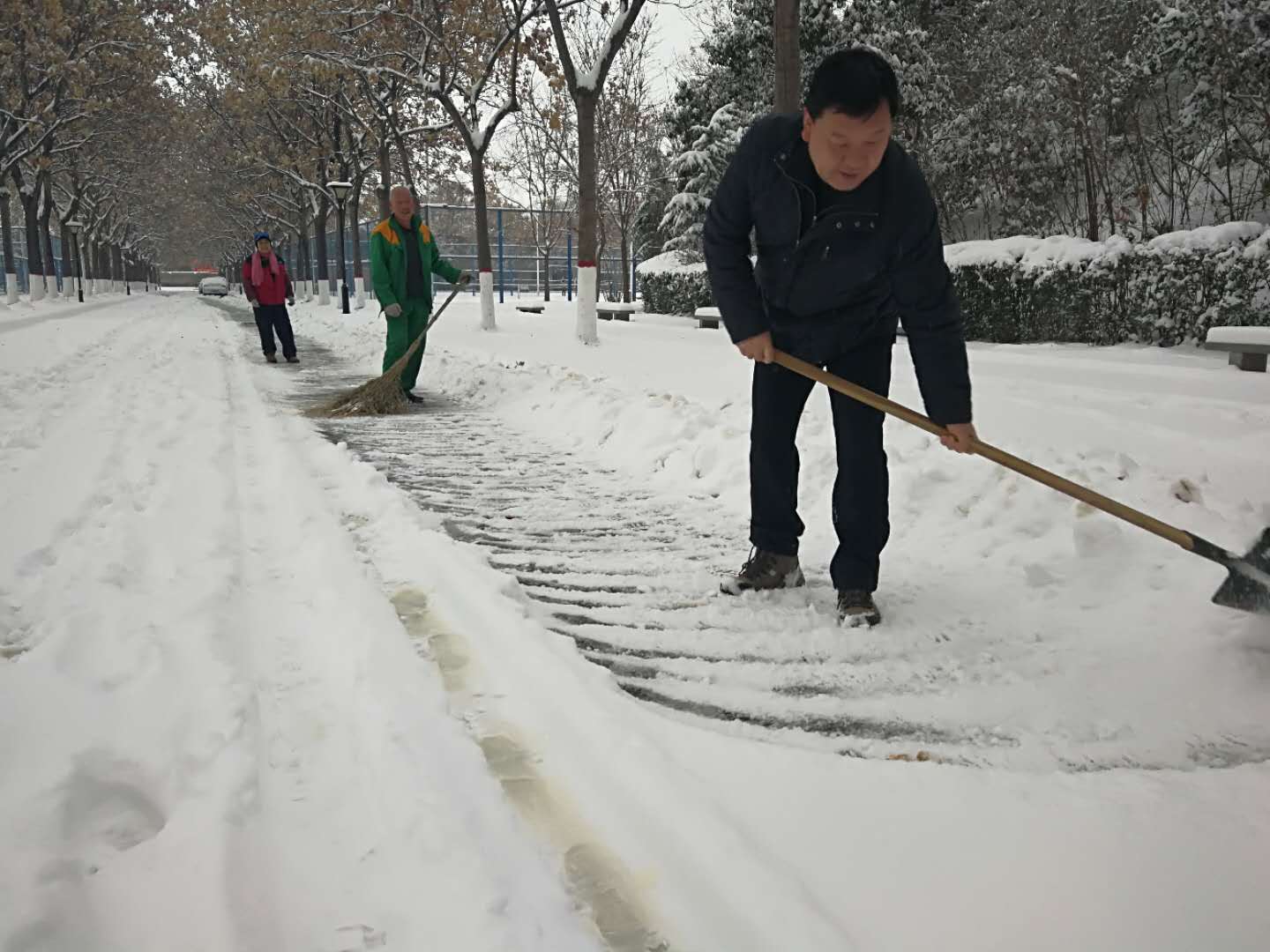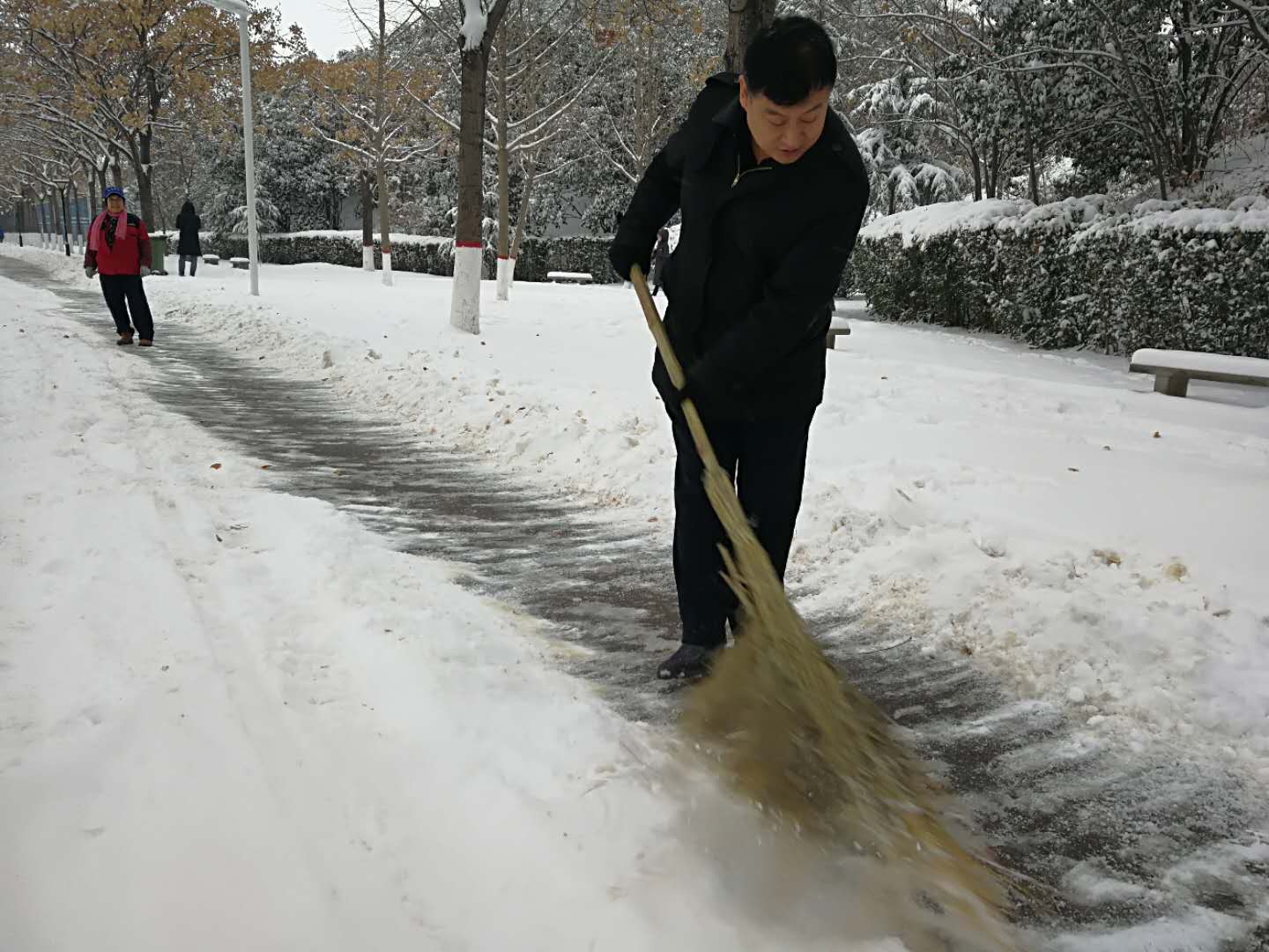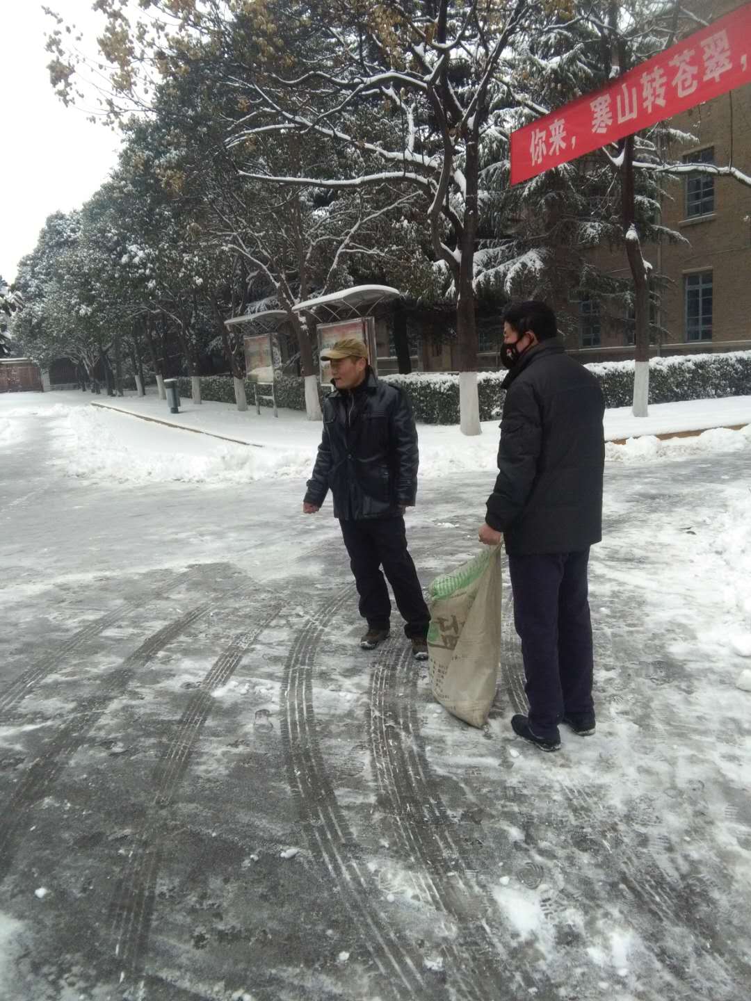 早晨还未上班,咸阳师院秦渭两个校区的后勤职工在后勤班子成员的带领下,按照先一天的部署,用铁锨、扫把打扫积雪,并抛洒工业用盐消雪。后勤班子成员以身作则,身先士卒,积极参加扫雪活动,和后勤职工一起,一直干到早晨十点多,后勤职工还一直忙于扫雪。