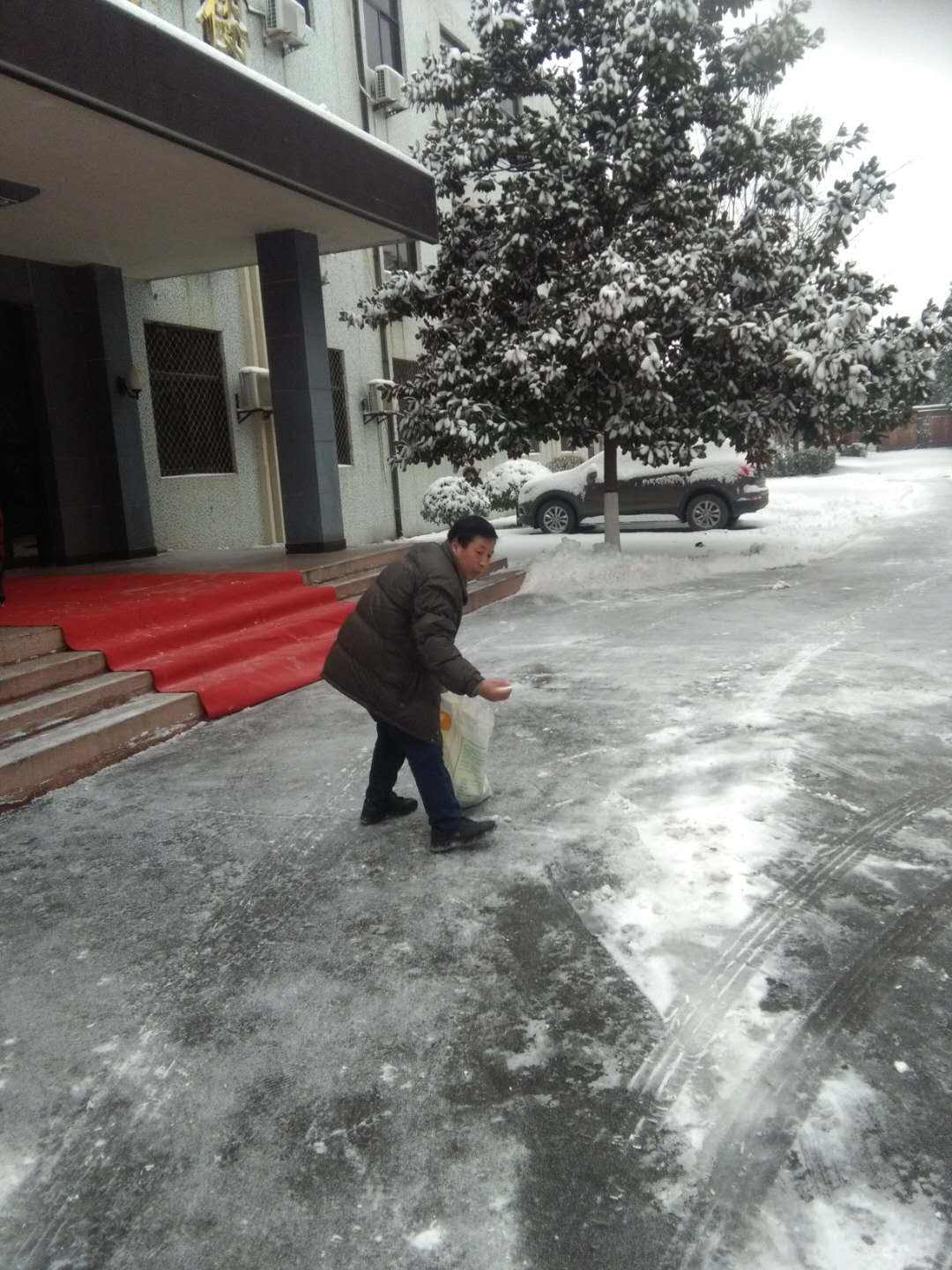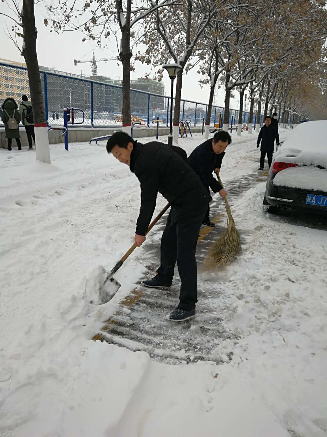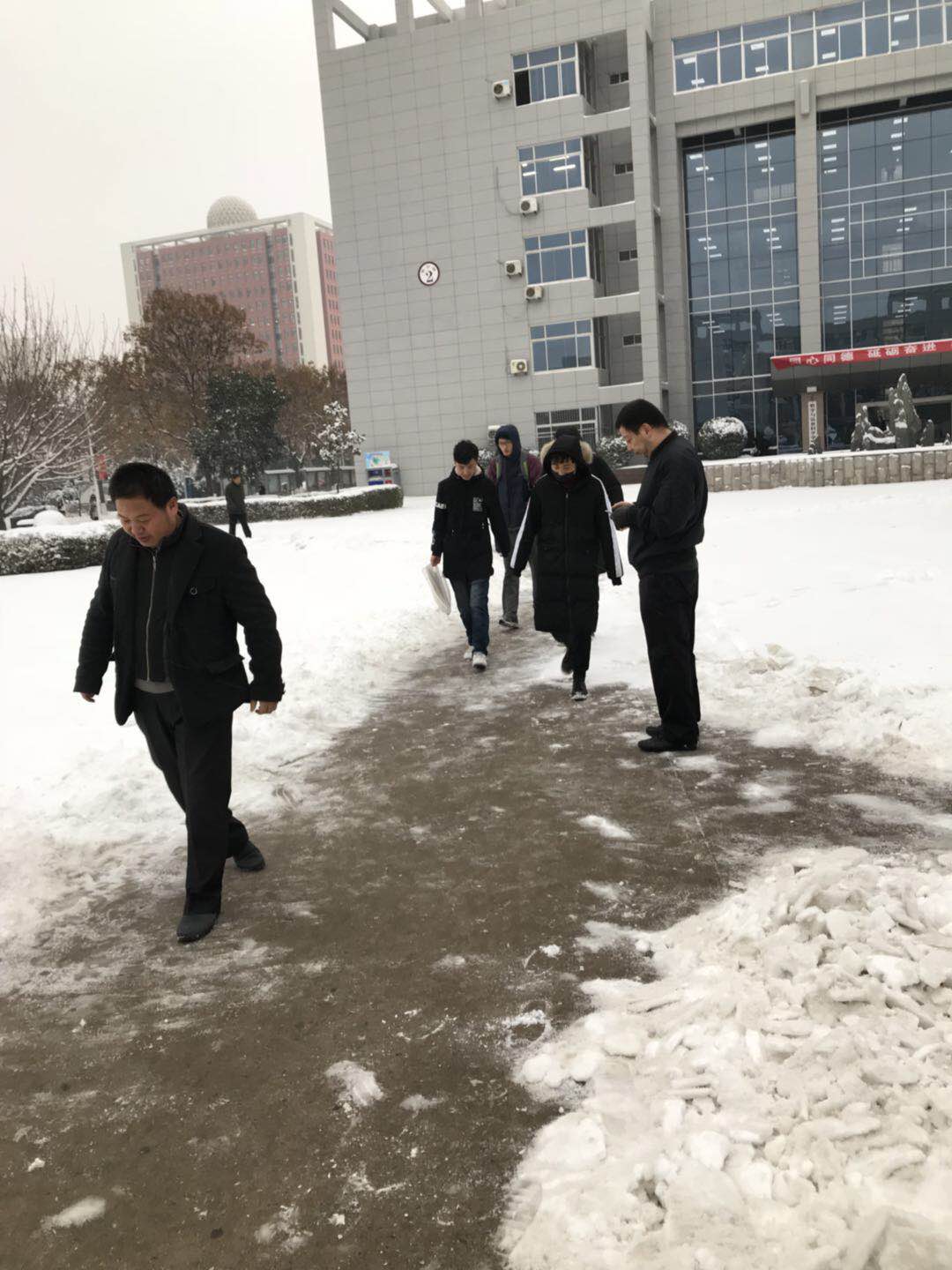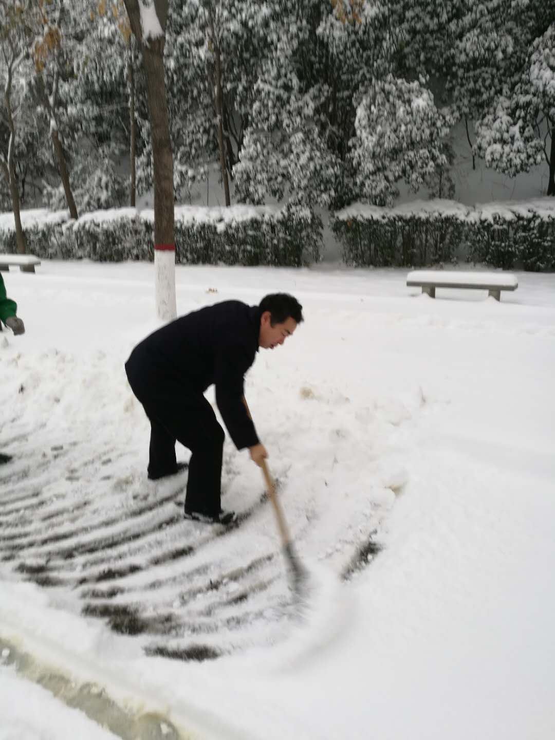 早晨还未上班,咸阳师院秦渭两个校区的后勤职工在后勤班子成员的带领下,按照先一天的部署,用铁锨、扫把打扫积雪,并抛洒工业用盐消雪。后勤班子成员以身作则,身先士卒,积极参加扫雪活动,和后勤职工一起,一直干到早晨十点多,后勤职工还一直忙于扫雪。