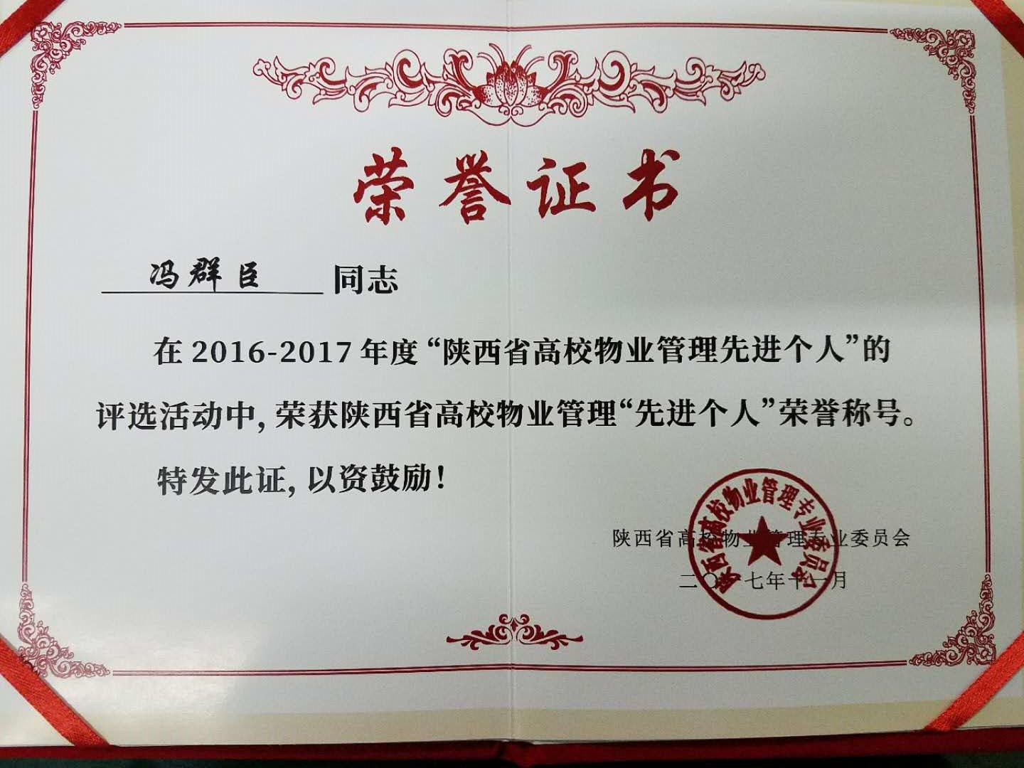11月23日-25日,由陕西省高校物业管理专业委员会主办的“陕西省高校物业管理专业委员会(2017)年会”在西安市召开。后勤处(集团)冯群臣同志被评为“陕西省高校物业管理先进个人”。