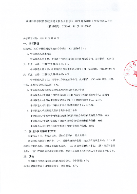 beat365正版唯一官网必一智慧校园建设校企合作项目(BOT服务项目)中标候选人公示