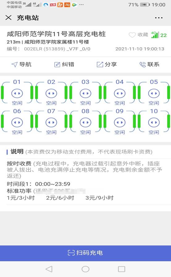 4.弹出每组充电桩的使用情况---点击下面“扫描充电”---开始充电。用户可自行选择充电金额,并可在手机上随时关注充电状态。