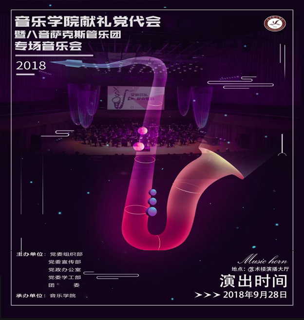 为了庆祝祖国69年华诞,喜迎学校第二次党代会的召开,beat365举办献礼党代会暨八音萨克斯管乐团专场音乐会。音乐会将于2018年9月28日在艺术楼演播厅上演。