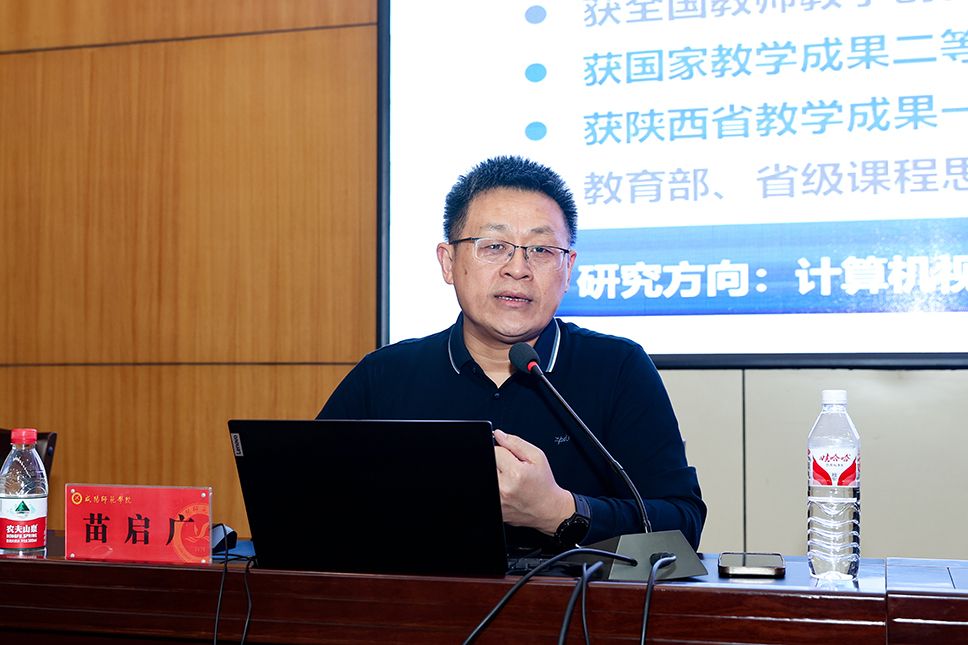 报告会上,苗启广以“人工智能赋能高等教育的探索与思考”为题,阐述了国家及教育部推进教育数字化、推动人工智能赋能高等教育的相关政策。依据集成化、智能化、国际化的 3I 理念,以西安电子科技大学为例,从助教、助学、助管和助研的角度,介绍了如何将人工智能技术应用于教育教学,如何赋能教育教学,提升效率;如何赋能教育教学管理,实现智能化治理,达到人工智能赋能教育教学的目标等。苗启广的报告立足于教育数字化的全局,视野开阔,案例丰富,既有理论指导,又有实践展示,拓展了全校干部对人工智能赋能高等教育的认知,对深刻理解并准确把握“人工智能+”的重要作用和实践要求具有指导意义。