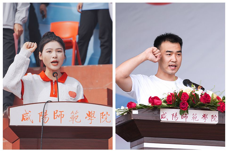 体育学院教师李琳、秦都书院教师田耕代表裁判员宣誓,马克思主义学院学生严子怡、秦都书院学生张裕欣代表运动员宣誓。