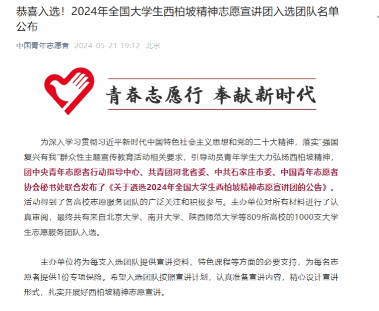 近日,团中央青年志愿者行动指导中心、共青团河北省委、中共石家庄市委、中国青年志愿者协会秘书处联合发布了《关于遴选2024年全国大学生西柏坡精神志愿宣讲团的公告》。beat365“物理与电子工程学院追光志愿服务队”志愿宣讲团成功入选。