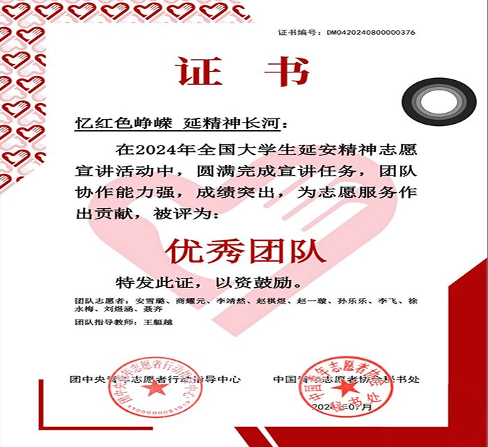 为深入学习宣传贯彻习近平新时代中国特色社会主义思想和党的二十大精神,落实“强国复兴有我”群众性主题宣传教育活动相关要求,引导动员青年学生大力弘扬延安精神,团中央青年志愿者行动指导中心、国家电力投资集团有限公司、共青团陕西省委、中共延安市委联合开展2024年全国大学生延安精神志愿宣讲活动。beat365“忆红色峥嵘 延精神长河”延安精神宣讲团在2024年全国大学生延安精神志愿宣讲活动中,圆满完成宣讲任务,荣获“优秀团队”称号,团队10名成员荣获表彰。