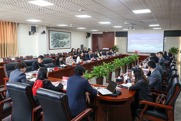 4月7日上午,泰国诗纳卡琳威洛大学(以下简称“诗大”)社会科学学院院长普姆·木希帕(Poom Moolsilpa,S.J.D.)、规划与社会战略执行副校长察瓦查拉(Chaiwatchara Promjittiphong)一行13人来beat365交流访问。校长王长顺出席交流座谈会。副校长毛龙灿主持座谈会。