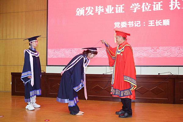 王长顺为毕业生代表颁发毕业证、学位证并扶正流苏。他在讲话中代表学校向全体毕业生致以热烈祝贺,回顾了学子们与学校共奋进的四年,并对毕业生提出四点殷切期望:一是要承历史之厚重,铸文化自信之基,勉励学子铭记咸阳“周礼秦制”基因,传承以“艰苦奋斗、自强不息”为核心的咸阳师院精神,将文化自信融入血脉,以创业精神开拓事业,用师范精神浇灌育人沃土。二是要应时代之召唤,勇担复兴之责,鼓励大家在百年变局与科技革命浪潮下,应教育、科技、人才强国之需,扎根讲台、投身创新、锤炼本领,做好个人发展的“责任人”、家庭幸福的“守护者”和社会进步的“推动者”。三是要传师道之精粹,绘就人生华彩,希望学子追求真理、厚德载物,以“学高”锤炼匠艺,以“身正”守护初心,在平凡岗位创造不凡的成绩。四是要创复兴之伟业,争做时代主角,寄语同学们要以“挺膺担当”的使命感、“舍我其谁”的斗志和“主角姿态”,让青春在推进中国式现代化的伟大征程上绽放最璀璨的光芒。