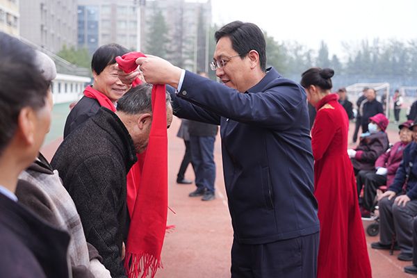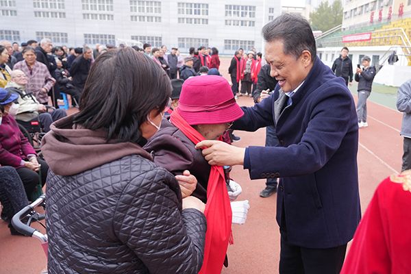 王长顺为年满90岁的福寿老人佩戴围巾,并为他们送上诚挚的祝福。宁海军为获得幸福奖、银龄奖的老师们佩戴围巾,表达了敬意与关怀。