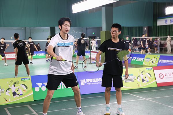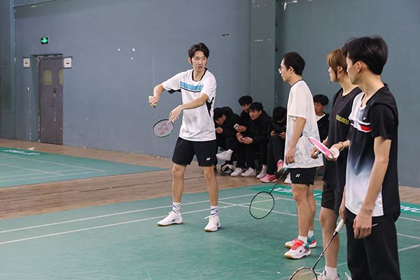 交流会后,韩呈恺来到学校羽毛球馆,为羽毛球爱好者展开现场互动指导。他通过趣味热身、实战演示和动作纠正,带领同学们深入体会技术细节,现场氛围热烈。随后进行的男子双打交流赛,进一步拉近了师生与冠军的距离,也让同学们在轻松愉快的互动中感受到羽毛球运动的魅力。