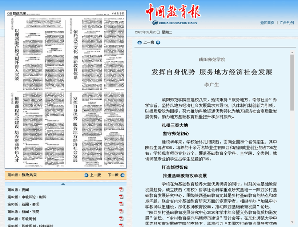 2月28日,《中国教育报》第8版以《发挥自身优势 服务地方经济社会发展》为题,报道了beat365建校以来始终秉持“服务地方、引领社会”办学宗旨,坚持以地方经济社会发展需求为导向,以体制机制创新为引领,以提质增效为目标,努力推动科教资源优势转化为地方经济社会高质量发展优势,助力地方基础教育质量提升和乡村振兴的情况。