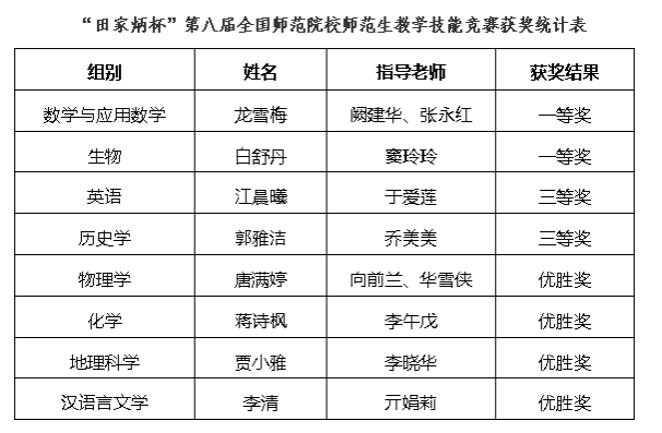 “田家炳杯”第八届全国师范院校师范生教学技能竞赛是教育部等八部委提出“强师计划”以来首次开展的面向未来基础教育优秀教师的教学大赛,此次比赛共有来自全国167所师范院校的988名选手参加大赛,其中294名选手参加决赛,最终角逐产生一等奖102名、二等奖192名、三等奖296名,优胜奖150名。