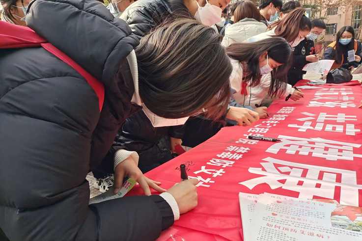 在学馨苑广场活动现场,志愿者为学生发放活动宣传手册、彩页1000多份,引导学生共同参与,携手应对艾滋病流行带来的风险与挑战,倡导全社会共建共治共享;校医院医护人员就艾滋病的流行概况、传播途径、相关危害及防护措施等内容为师生进行讲解和普及,增强自我保护意识,守护青春健康;现场师生在宣传横幅上郑重签名,承诺会把防艾的相关知识牢记于心,积极践行健康的生活方式,争做一名合格的防艾宣传员,引导更多的人了解并掌握艾滋病的防治知识,消除对艾滋病患者的歧视,为艾滋病防治工作创造良好的社会环境。