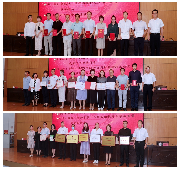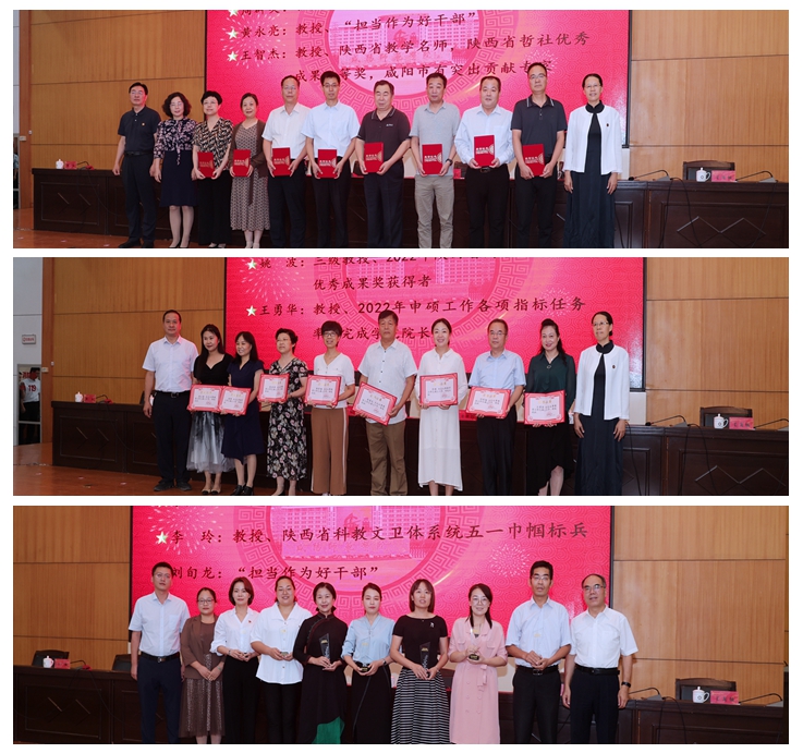 大会表彰了2021-2022学年度获得厅局级以上教学、科研奖励以及荣誉称号的教师,为从事教育教学工作三十年的教职工颁发了荣誉证书,为2021年校园优秀新媒体平台颁发奖牌,为2021年度考核优秀单位、“干事创业好班子”和优秀处级领导班子颁发了奖牌。于右任书法学院院长王智杰教授代表全校教职工发言。
