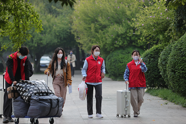 “暖”就是暖心服务、贴心服务。各二级学院以线上直播形式带领新生熟悉校园环境及报到注册流程,助力学生返校高效、快速、安全。学校领导深入新生报到现场,检查新生接待情况。2000余名志愿者推着450余辆小板车帮助新生搬运行李、快速完成报到手续。校党委书记赵万东、党委副书记周群英深入公寓查看新生宿舍入住情况,对孤儿、残疾学生慰问走访,为学生送去学校党委的深切关怀和殷切希望。按照学生静态管理要求,各二级学院党委副书记、辅导员93人第一时间入驻学生公寓,从出入管理、个人防护、思想教育、关心关爱、应急处置等方面为学生提供贴心服务。各二级学院精心准备“手绘树”、“校训”口罩、“暖心通讯录”等入校礼物,帮助新生尽快适应新环境。目前,全校4000余名入校新生已领取课程教材,为投入新的学习阶段做好准备。