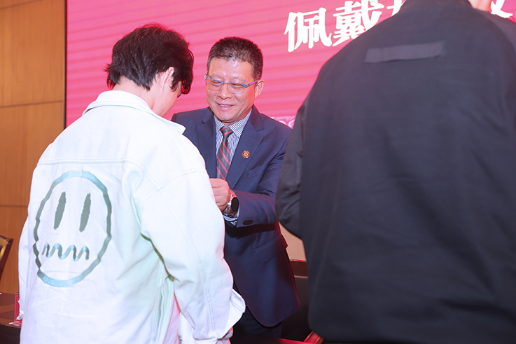 校领导、各有关部门负责人及二级学院党政负责人为2022级新生代表佩戴校徽。