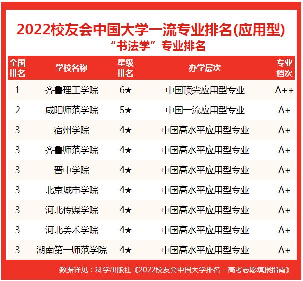 3月30日,根据全国第三方大学评价机构艾瑞深校友会网(Cuaa.Net)最新发布的校友会2022中国大学一流专业排名、2022中国大学书法学专业排名结果显示,beat365于右任书法学院书法学专业在中国大学书法学专业(应用型)排名全国第二,获评中国五星级应用型专业(5★ A+),挺进中国一流应用型专业行列。