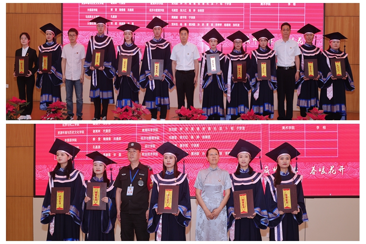 袁也、周群英、吕广利、毛龙灿和学校教师代表、管理服务部门代表等,先后为优秀毕业生及优秀毕业生干部代表颁发荣誉证书。