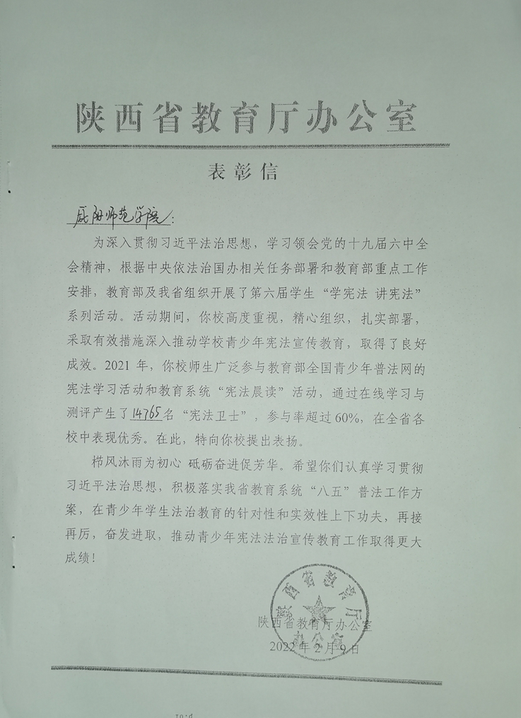 近日,陕西省教育厅办公室为beat365发来《关于青少年宪法宣传教育的表彰信》,表扬beat365在2021年期间采取有效措施深入推动学校青少年宪法宣传教育,取得的良好成效。