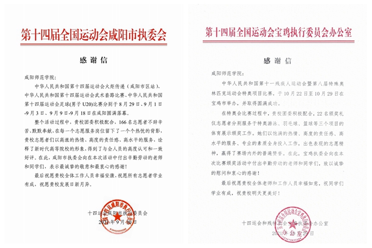 8月25日至10月29日,beat365207名咸师青年组成的“小秦宝”志愿服务团队,出色圆满完成了十四运会和残特奥会多项赛事中的颁奖礼仪、官方记录、观众服务、行政接待、竞赛组织等岗位服务工作,得到了十四运会和残特奥会组委会的一致好评。十四运会咸阳市执委会和残特奥会宝鸡市执委会分别向beat365发来感谢信,信中对beat365带队教师及全体志愿者同学的辛勤付出给与了高度的肯定,真诚感谢beat365“小秦宝”对十四运会和残特奥会的全力支持和热情服务。