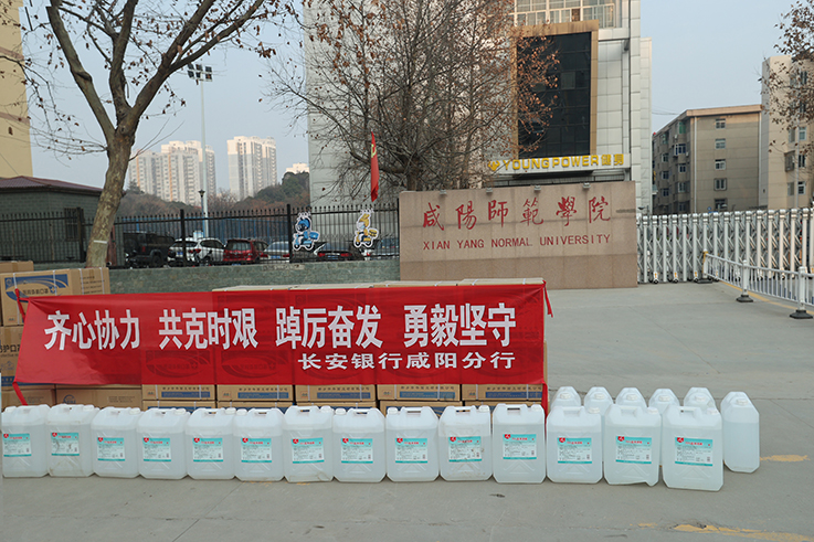 渭城区政府捐赠2万只口罩、10箱方便面、10箱火腿肠、8箱饼干及2吨蔬菜;长安银行捐赠25升酒精20桶,N95口罩1万个,一次性医用口罩3万个;陕西金沙河面业有限责任公司捐赠510袋面粉(10kg/袋),5100包扁袋刀削面(200g/包);咸阳玖成广告装饰工程有限公司捐赠600L医用酒精、40套防护服;淳化山里人电子商务有限责任公司捐赠240L酒精。