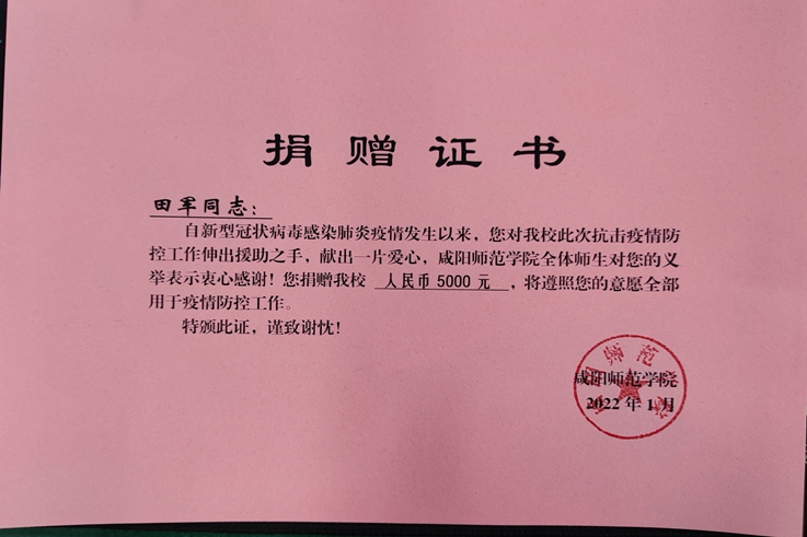 田军表示:西安疫情发生后,咸阳也受到波及。这座城市有我的女儿正在咸师院就读,有我的战友、同学在咸阳各条战线上工作,他们的健康状况时刻牵动着我的心。2019年女儿不慎在学校摔伤,受到了来自老师、同学、亲友们无微不至地关怀照顾,让我深深感受到了咸师院这所大学的温度。而今,疫情肆虐,自己捐资5000元,用于学校购买抗疫物资,早日驱散疫情的阴霾。