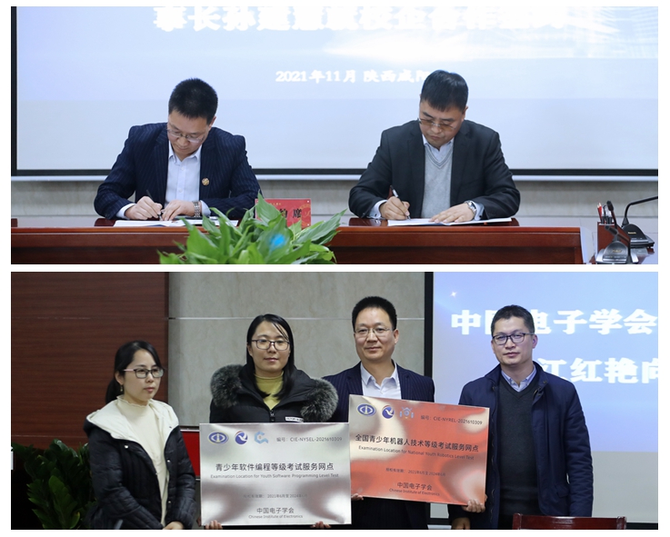 中国电子学会陕西省服务中心理事长白浩、江红艳向全国青少年机器人等级考试beat365正版唯一官网必一考点授牌。