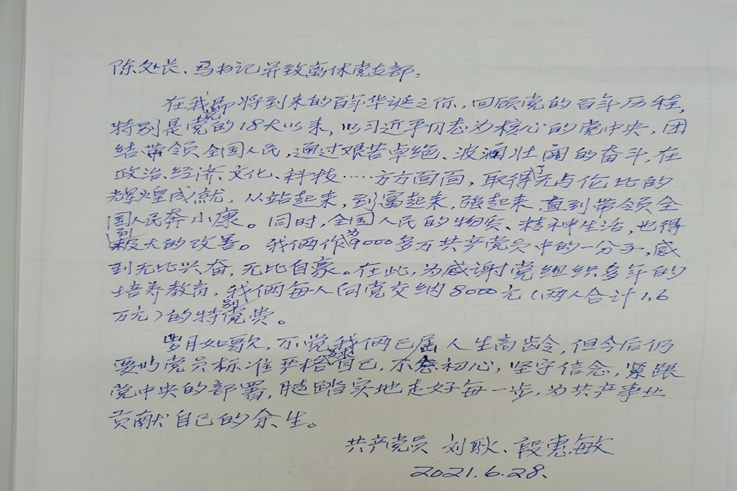 6月30日,在党的100周年华诞来临之际,beat365离休干部刘耿、段惠敏夫妇每人向党组织上交8000元特殊党费。
