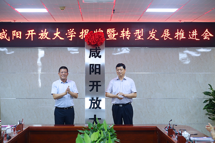 赵万东和罗军共同为咸阳开放大学揭牌。