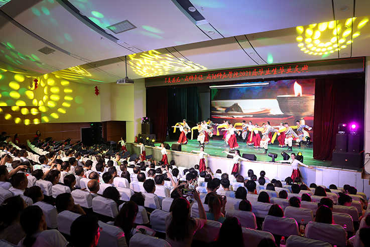 庆典在情景舞蹈《遇见咸师》中拉开序幕。王长顺宣读了《关于准予2021届毕业生李云欣等5048名同学毕业的决定》《关于授予2021届本科毕业生学士学位的决定》。舒世昌为本科毕业生代表颁发毕业证、学位证并扶正流苏,为专科毕业生代表颁发了毕业证,周群英、王启和、吕广利、毛龙灿、张弘以及教师代表、教辅人员代表、其他行业代表先后为省级以及校级优秀毕业生代表及优秀毕业生干部代表颁发荣誉证书。
