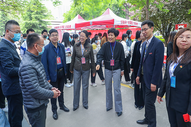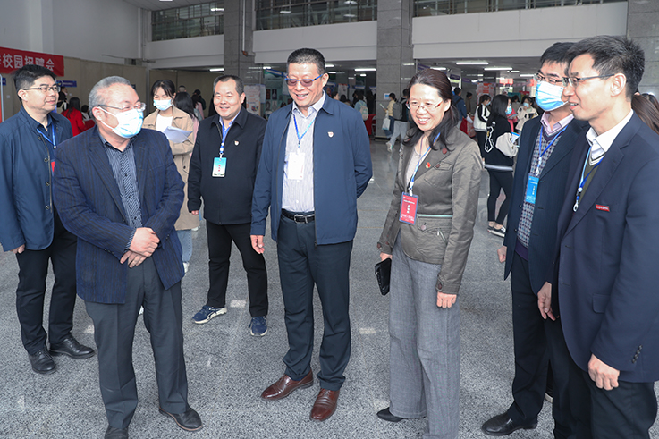 为贯彻落实习近平总书记在党史学习教育动员大会上的重要讲话精神,落实国家“六稳” “六保”就业政策,进一步促进beat365毕业生更高质量更充分就业,切实把党史学习教育成效转化为“我为师生办实事”的内生动力,4月17日,beat365举办2021届毕业生春季校园招聘会。校党委书记赵万东、党委副书记周群英、咸阳市人才交流服务中心主任别立华到场指导,并与用人单位、毕业生亲切交谈。