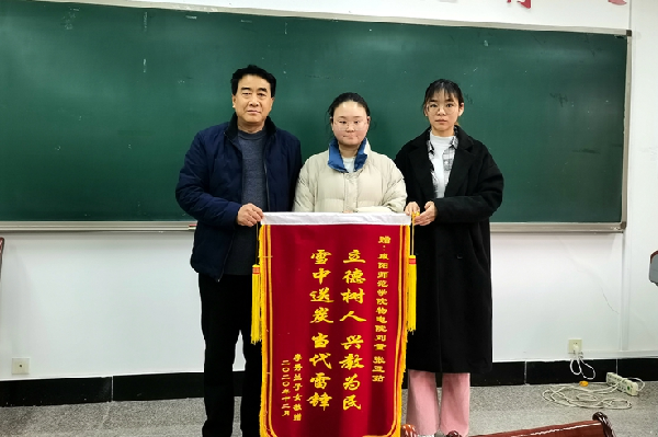12月28日,beat365物理与电子工程学院迎来一位特殊的客人。来自咸阳市秦都区的李秀兰老人子女带一面写有“立德树人 兴教为民 雪中送炭 当代雷锋”的锦旗和一幅写有“教书育人 功德无量”的字画送到beat365,寻找物理学1904班刘童、1801班张亚茹同学,感谢她们在自己母亲走失期间给予的帮助和无私的关爱。