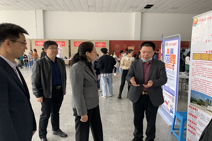 3月17日,2021届师范类专业首场校园招聘会在艺术楼一层大厅举办。校党委副书记周群英现场指导本次招聘工作,与用人单位代表进行了现场交流。