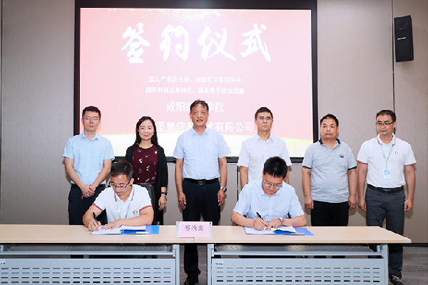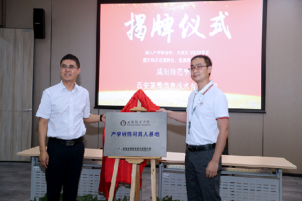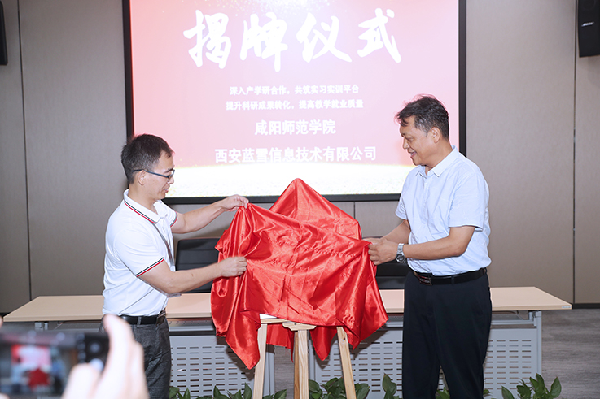 计算机学院副院长张伟代表学校与西安蓝雪软件信息技术有限公司总经理解保平签订实习实训基地共建协议,王长顺、教务处处长范广分别为软件研发基地和产学研协同育人基地揭牌。