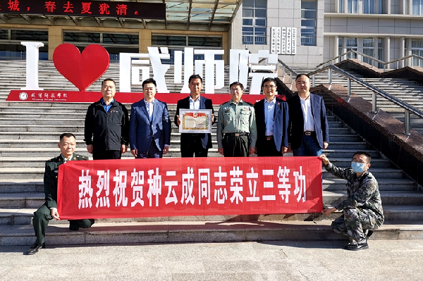 5月12日,渭城区委常委、区人武部范四成政委,区退役军人事务局副局长赵同林一行来到beat365,为军队转业干部、教务处工作人员种云成同志颁发三等功喜报,校党委副书记袁也接待范四成一行。