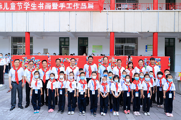 在仪式现场,少先队员为校领导佩戴红领巾,赵万东、舒世昌为小学生们用千纸鹤拼成的“放飞梦想”揭幕,并参观了学生书法、绘画、科技作品展。