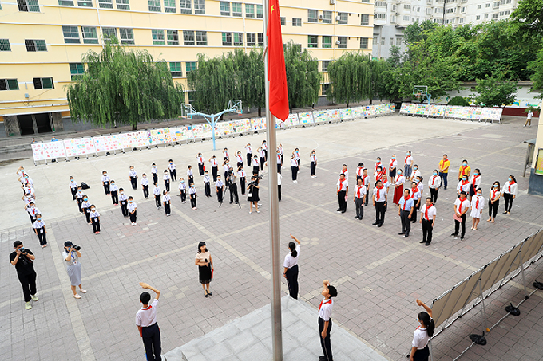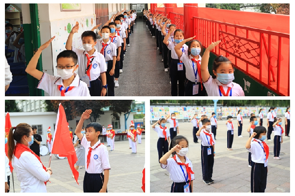 227名少先队员在队旗下庄严宣誓,光荣地加入中国少年先锋队。