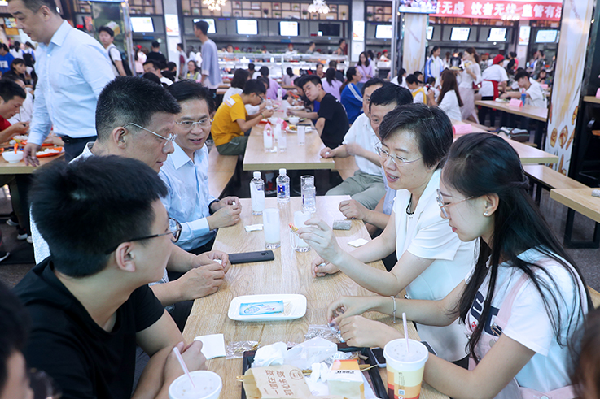 随后卫华来到beat365学馨苑餐厅,察看学生的用餐环境和用餐情况,仔细询问食品原料来源和价格情况,与正在就餐的学生亲切交谈、共进午餐并合影留念。