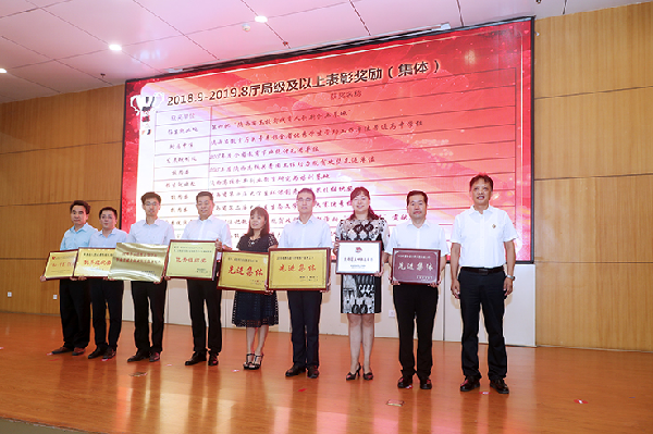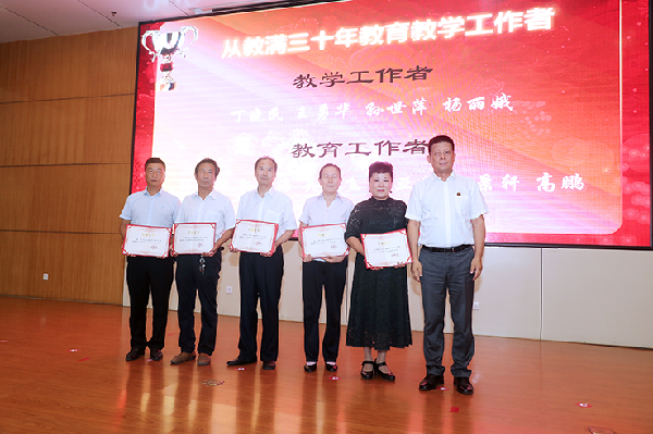 会上,校领导为受表彰的先进集体、先进个人以及从事教育教学满三十年的教职工颁发了奖牌和证书。教师和学生代表分别发言。