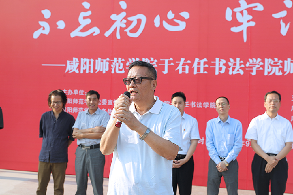 赵万东宣布活动开始。舒世昌致辞指出,在举国欢庆新中国成立70周年之际,举行师生同书千米长卷活动,是对祖国母亲最真挚的祝福;是探索书法学专业教学的新路子,检验学生的专业实践水平的新形式;是提倡中和为美的审美理念,鼓励师生创作出具有正大气象的高雅作品的新途径;是一次集体创作难得的专业挑战,更是一次难得的学习机遇。