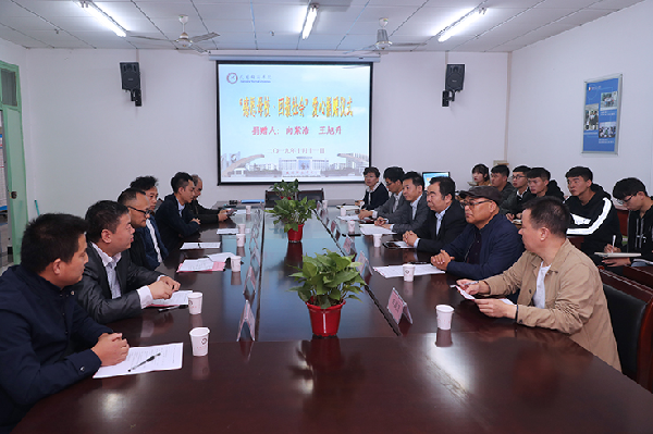 捐赠活动组织者、咸阳校友会会长马可非介绍了“感恩母校,回报社会”爱心捐赠活动的发起、物资募集以及校友们的捐赠物资等情况。捐赠人向紫浩、王旭升校友表达了对母校培养教育的感恩之情。