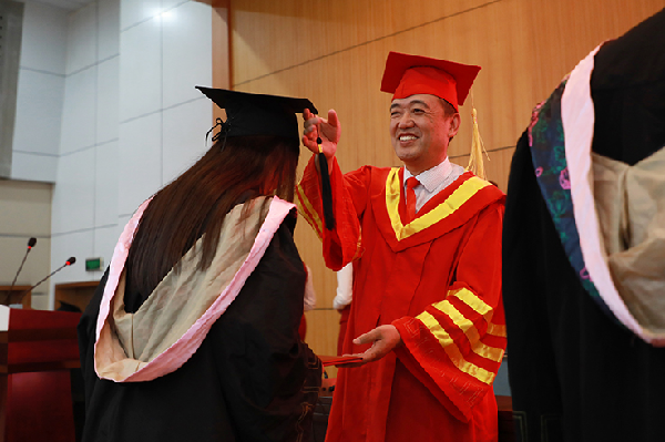副校长吕广利、美术学院院长崔伟刚,陈恩惠、李长民、马全社教授为毕业生整帽拨穗、颁发学位证书并合影留念。