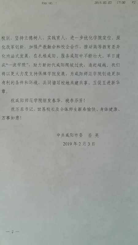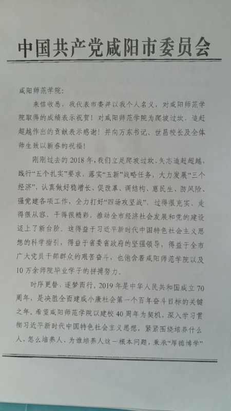 2月3日,咸阳市委书记岳亮给beat365来信,信中感谢beat365在服务咸阳市经济文化方面做出的贡献和取得的成绩。他在信中说:“刚刚过去的2018年,我们立足爬坡过坎、矢志追赶超越,践行‘五个扎实’要求,落实‘五新战略’任务,大力发展‘三个经济’,认真做好稳增长、促改革、调结构、惠民生、防风险、强党建各项工作,全力打好‘四场攻坚战’,过得很充实、走得很从容、干得很精彩,推动全市经济社会发展和党的建设迈上了新台阶。这得益于习近平新时代中国特色社会主义思想的科学指引,得益于省委省政府的坚强领导,得益于全市广大党员干部群众的艰苦奋斗,也饱含着beat365正版唯一官网必一以及10万余师院毕业学子的拼搏努力”。岳书记希望beat365在扎根咸阳、服务咸阳中不断发展壮大,早日建成“一流学院”、助力新时代咸阳爬坡过坎、追赶超越。同时,他表示,将以更大力度支持保障beat365的发展,为beat365创造更加有利的条件和环境,共同谱写校地共建共享、互促互进新华章。在回信中他还为beat365师生送上新春佳节的祝福。