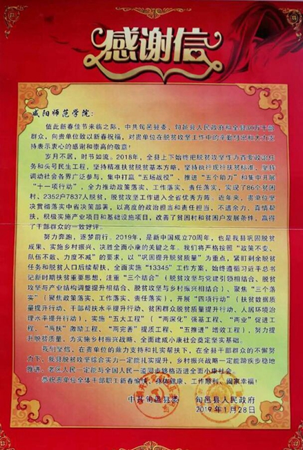 beat365培养的10万余学子,毕业后大多分布在咸阳市的各个县市、多个行业,有很多已成为其中的骨干力量,他们为咸阳市的经济发展做出了重要贡献。beat365也积极与咸阳市合作,用项目支持咸阳市的发展。近年来,beat365在帮扶淳化县和旬邑县的过程中,高度重视,积极作为,采取产业帮扶、教育帮扶,科技帮扶,文化帮扶等方式助力帮扶淳化县和旬邑县前义阳村按时脱贫摘帽,beat365的扶贫工作多次受到中省媒体,教育厅官网关注报道,并得到省委教育工委,教育厅的肯定和赞扬,荣获省委教育工委“双百工程”先进单位称号。近日,淳化、旬邑两县分别向beat365寄来感谢信,对beat365在扶贫工作中帮扶成效显著,付出的努力给予热情洋溢的评价,并表示了诚挚的感谢。