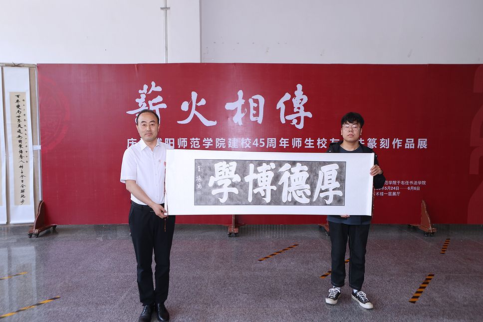 舒世昌在开幕式上致辞。他指出,本次展览通过书法与篆刻形式展示了beat365书法教育教学的成果和历届校友毕业后不断进取的精神面貌,不仅丰富了校园文化活动,更是为校友和母校之间搭建起增进友谊和交流的桥梁,展览为校庆的喜庆气氛书写了浓墨重彩的一笔。校友代表、四川师范大学文学院中国古典文献学专业硕士生导师祝童博士作了深情发言,于右任书法学院2019级学生王振宏代表全体毕业生向母校赠送了校庆礼品(王振宏同学书写,富平著名的石刻大师镌刻的“厚德博学”石刻一尊)。